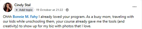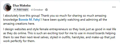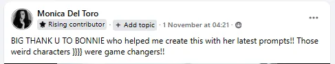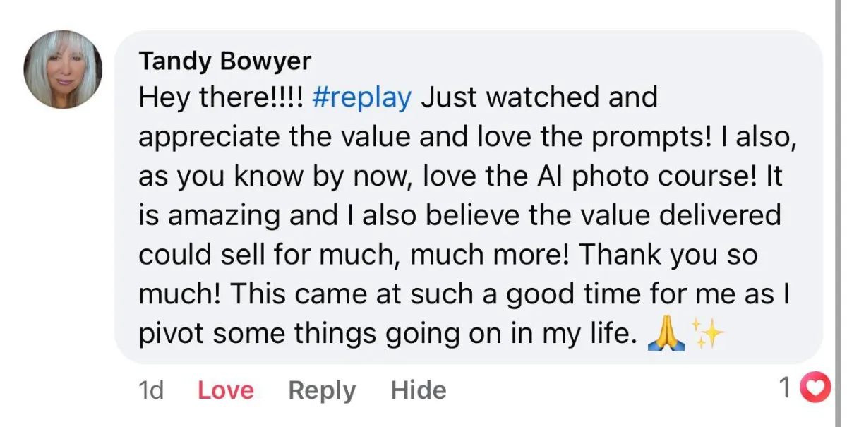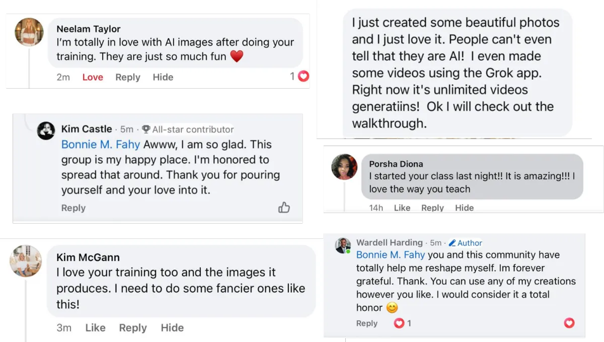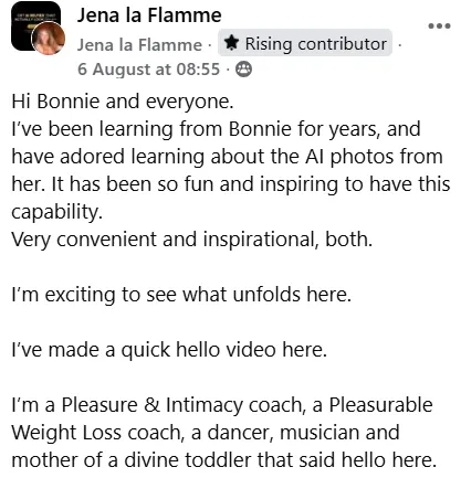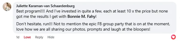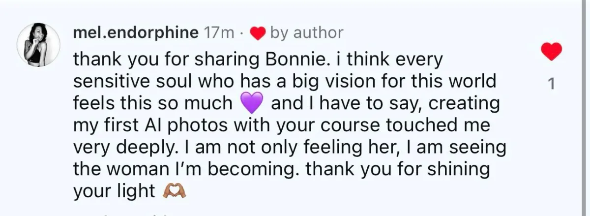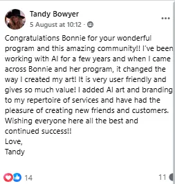 Bonnie is an absolute genius when it comes to AI. She will blow you away with her skills and talent. I've been using my AI images to fill in the gaps in my marketing, like creating extra Instagram stories and product images for my latest passive income products. It's been super helpful!