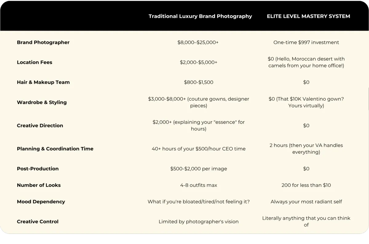 One luxury photoshoot: $5K. This complete system: $997. Refer just 2 friends and your investment disappears. The math literally doesn't make sense NOT to do this.