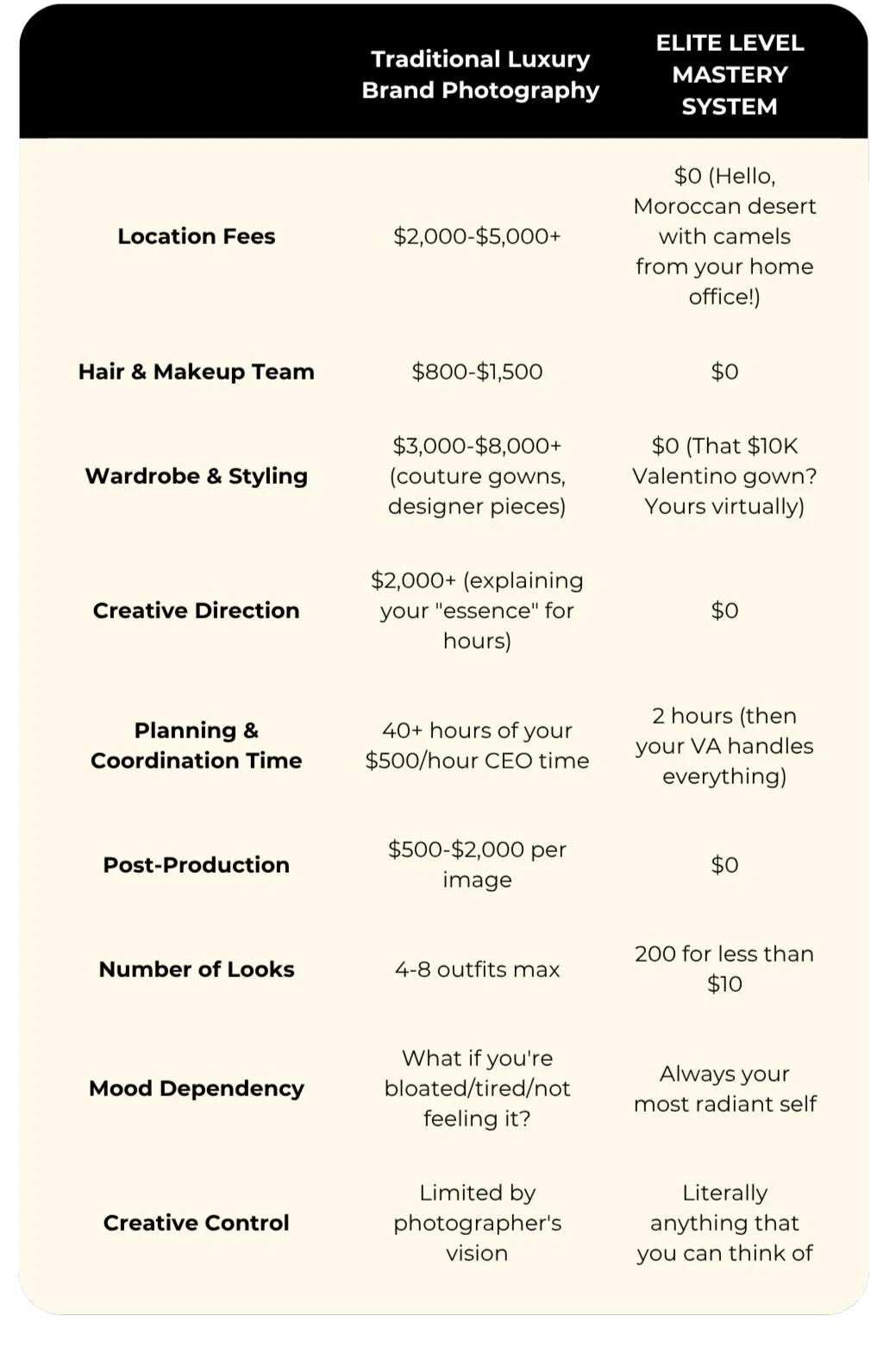 Second, when you've mastered creating $20K-quality imagery for under $10 in costs, and your clients are drowning in the same expensive photography trap you just escaped, offering this as a service becomes obvious. We're talking $2K-$5K packages that practically sell themselves. I can't guarantee you'll want to offer it, but I can guarantee your clients WILL want access to what you've learned.