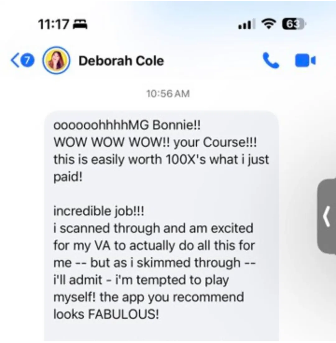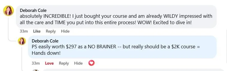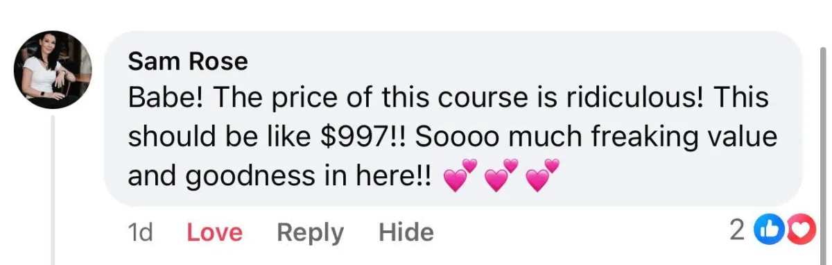 You get lifetime access to everything, customer support that won't ghost you (seriously, my team loves responding to everyone), and an amazing Facebook community where you can celebrate wins and get support from fellow entrepreneurs who genuinely care about your success. Plus, you'll get updates to the course because I'm constantly improving this system.