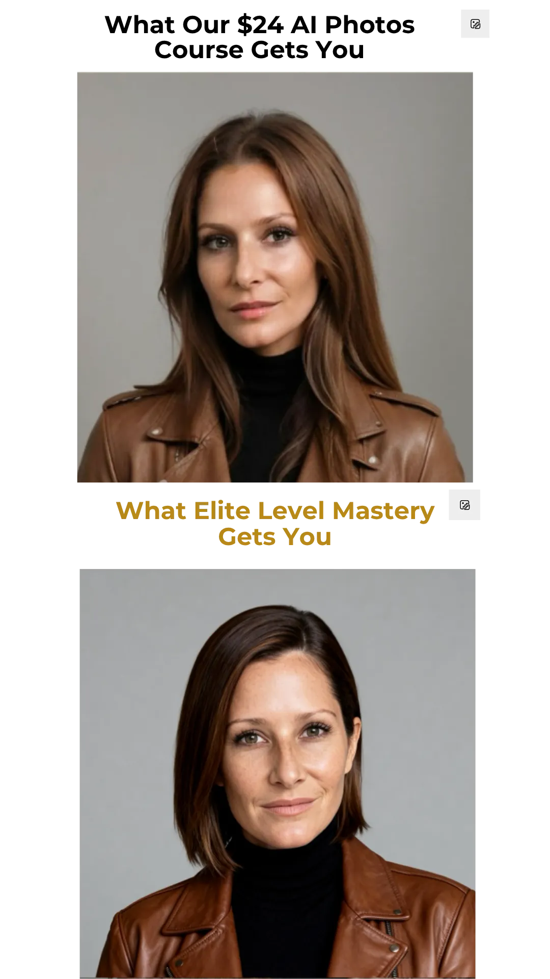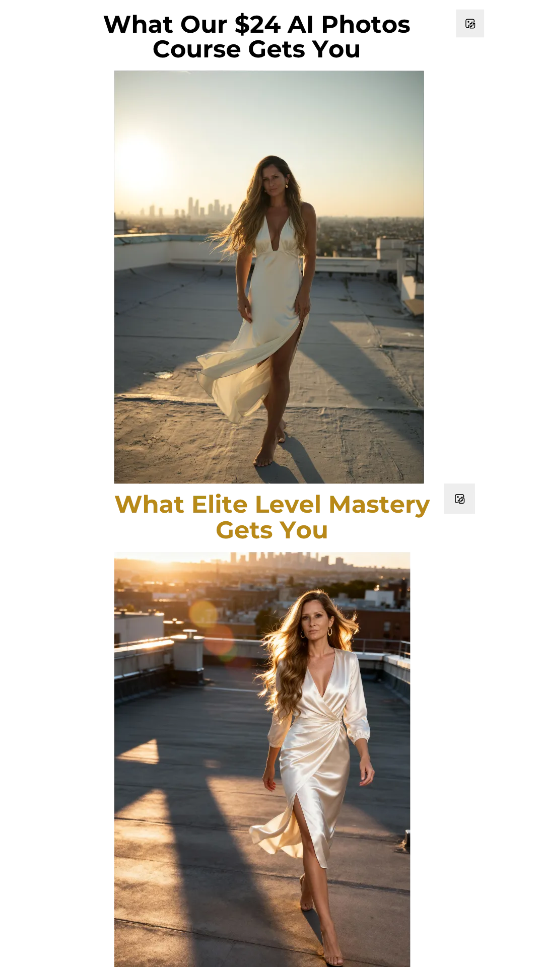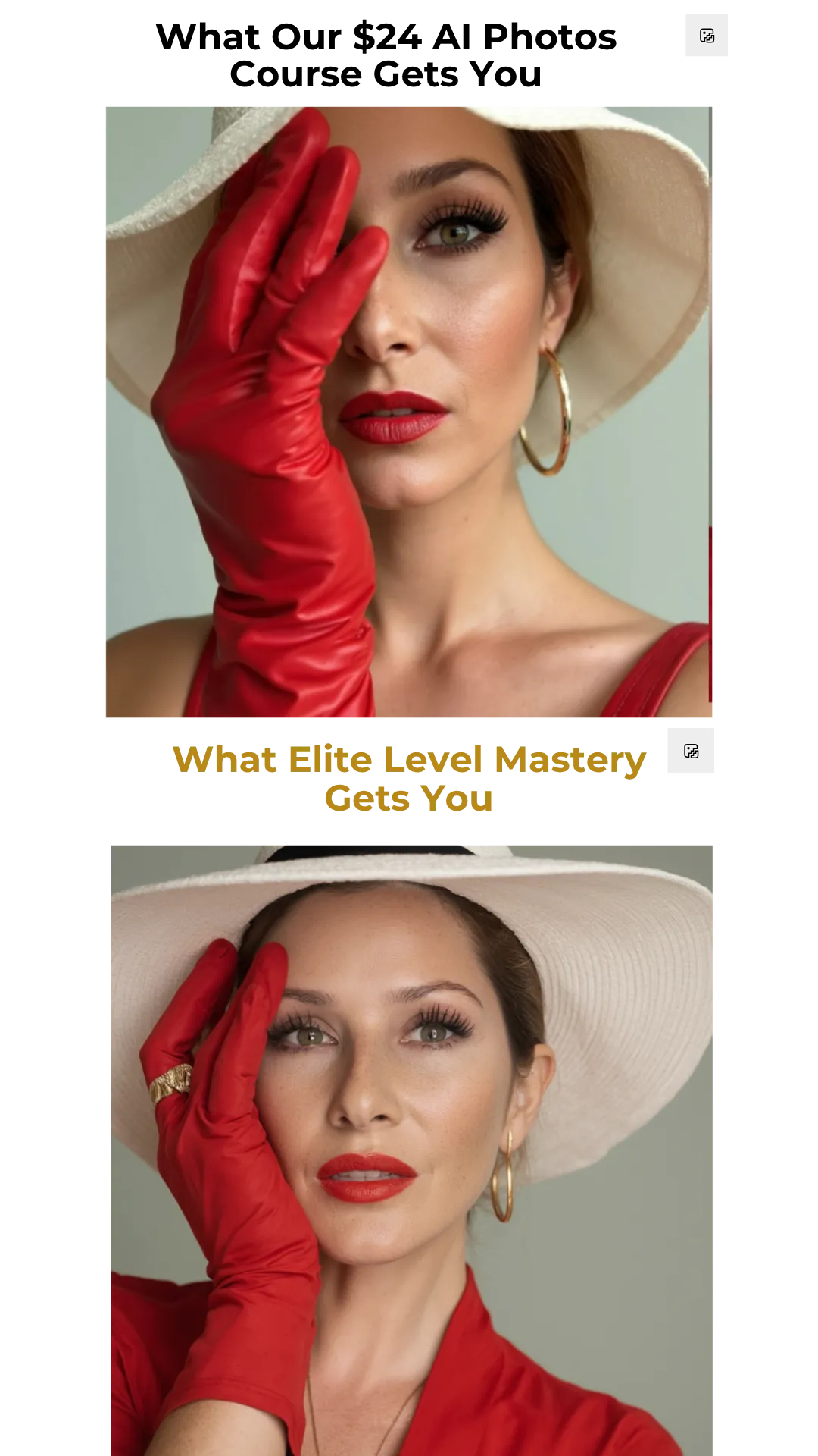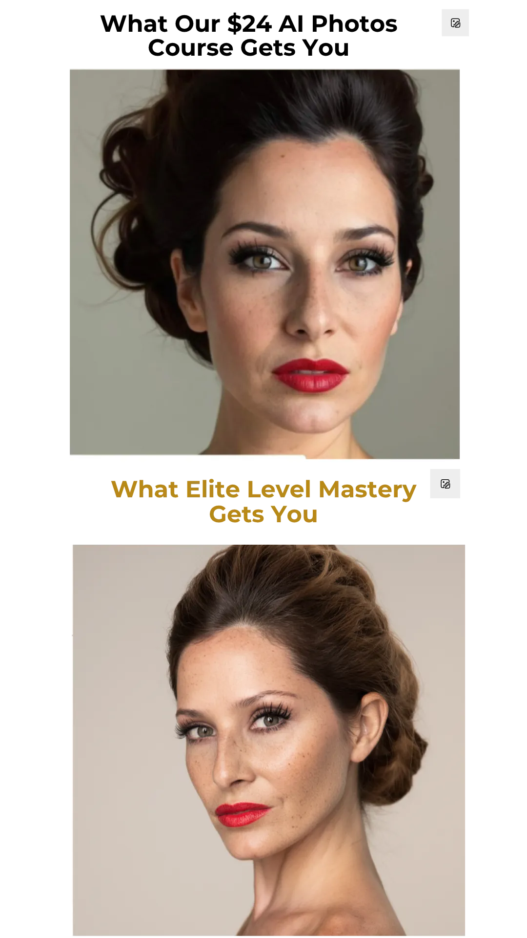 Think of it like this: the foundation course gets you started with AI imagery. This gets you imagery that rivals luxury photoshoots while building a complete business system around it. Both are valuable - this one just takes you further.