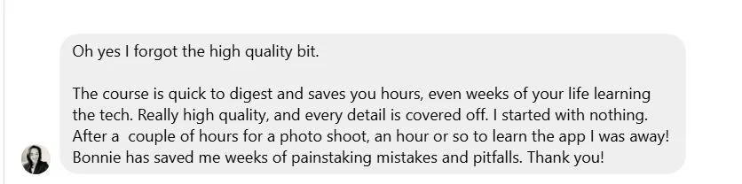 We also teach you how to do some more advanced things but the thing is, you only need great communication skills and a few secrets that I’ll be sharing with you to get on-brand photos in just 5 minutes.